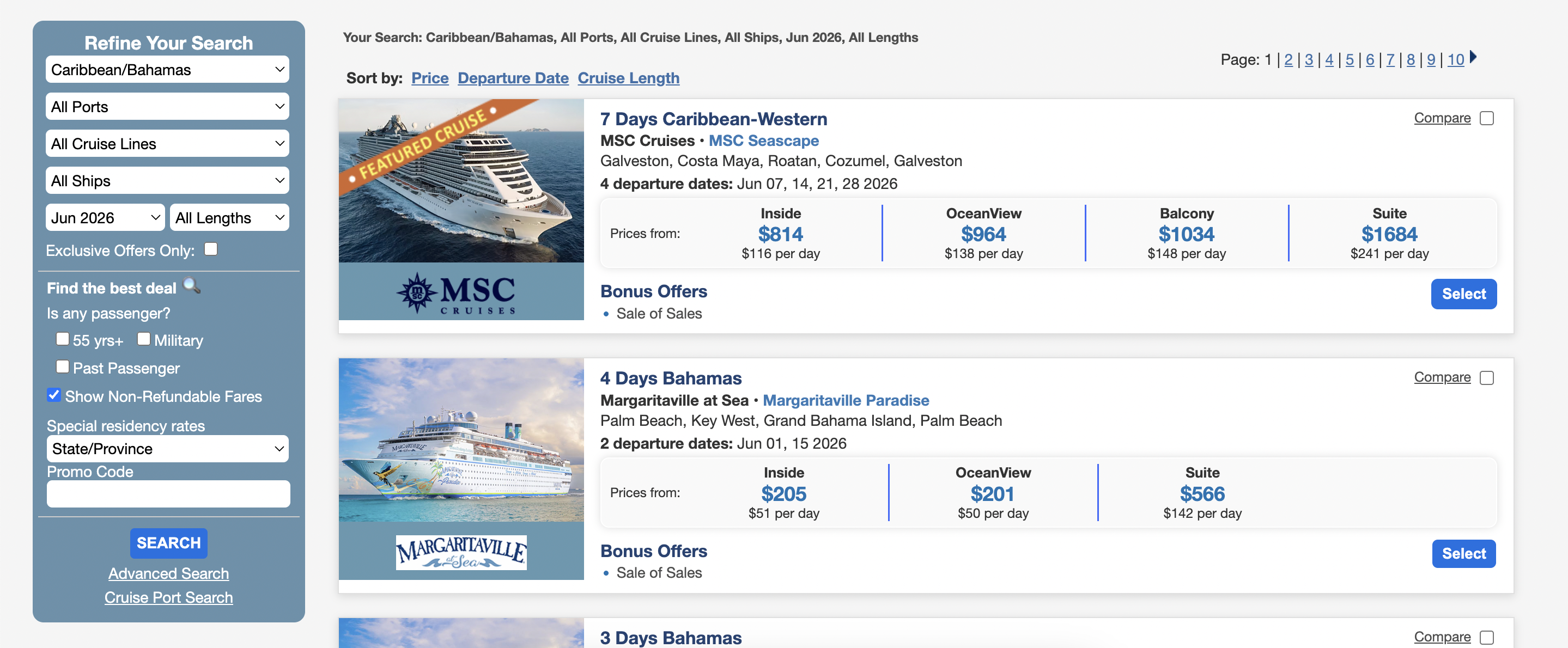 Users apply filters like price, cruise line, ship, duration, or departure port to refine search results.