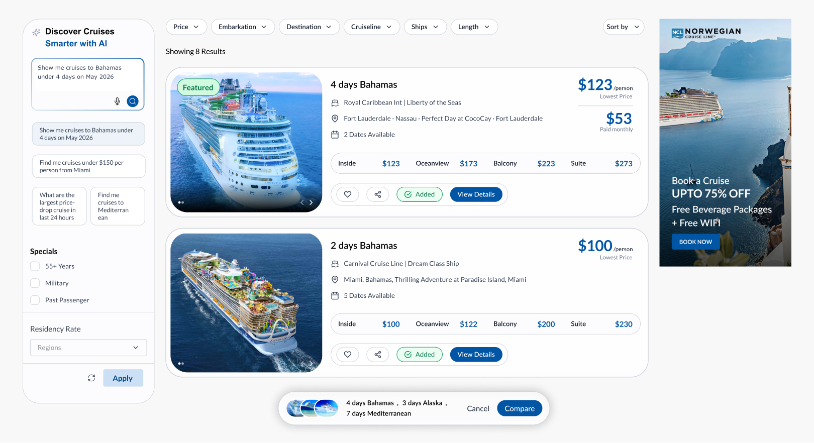 Introduce an AI-powered intelligent search filter that understands user intent, provides personalized recommendations, and simplifies cruise discovery without heavy manual filtering.