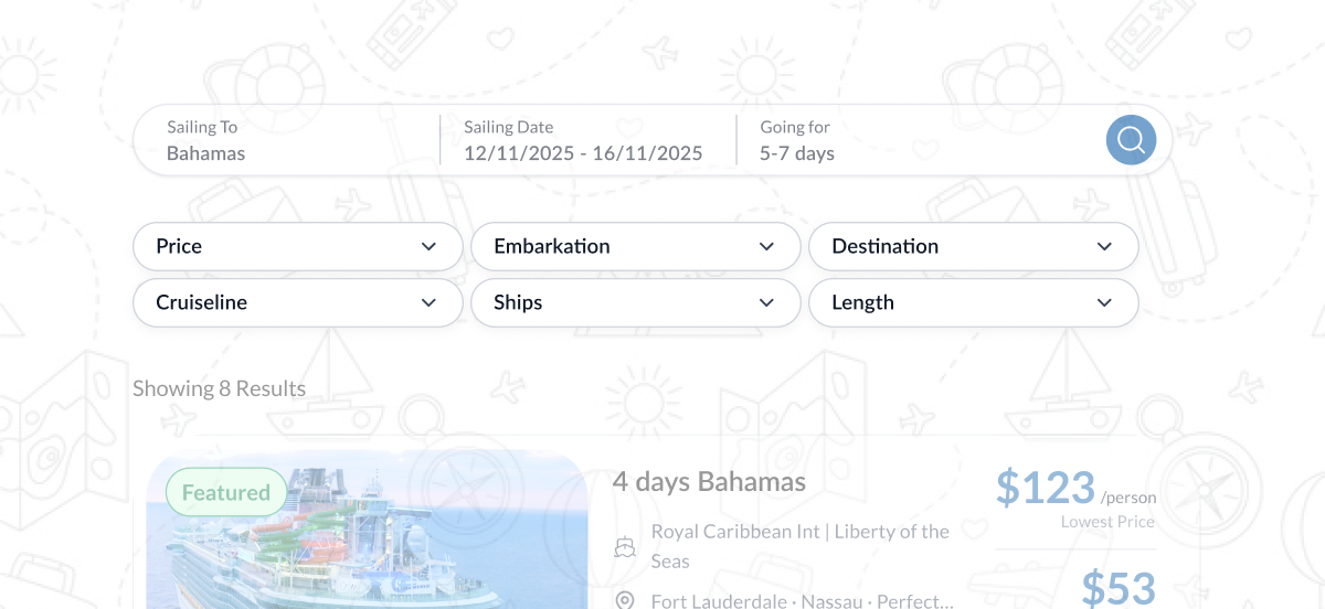 A user enters destination, embarkation port, or date range and views relevant cruise results instantly.