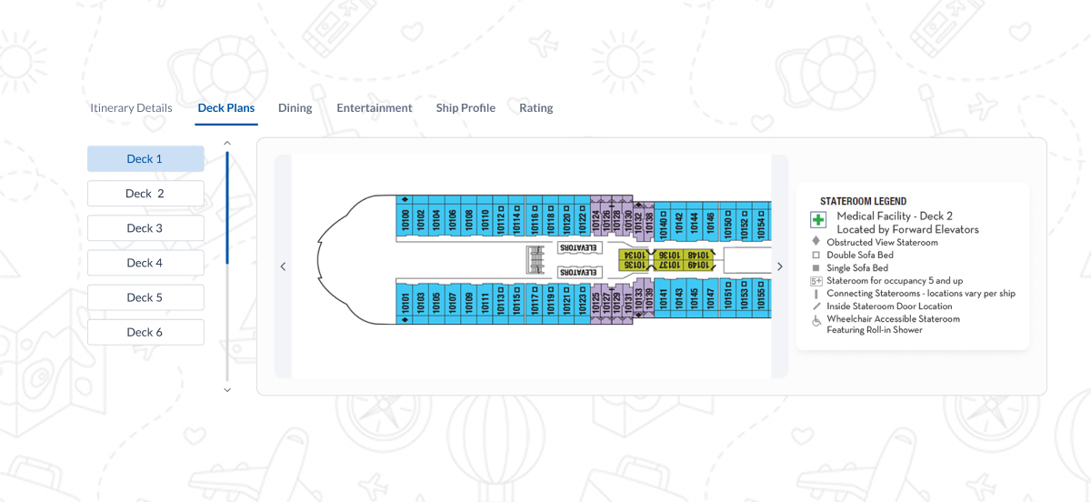 User views ship features, entertainment options, cabin categories, and deck plans.