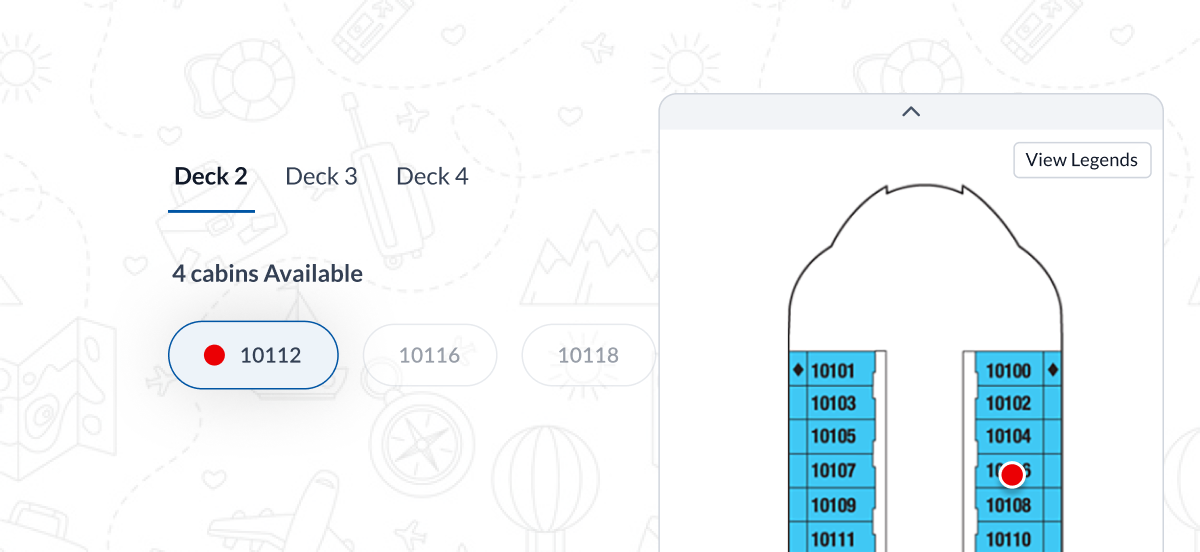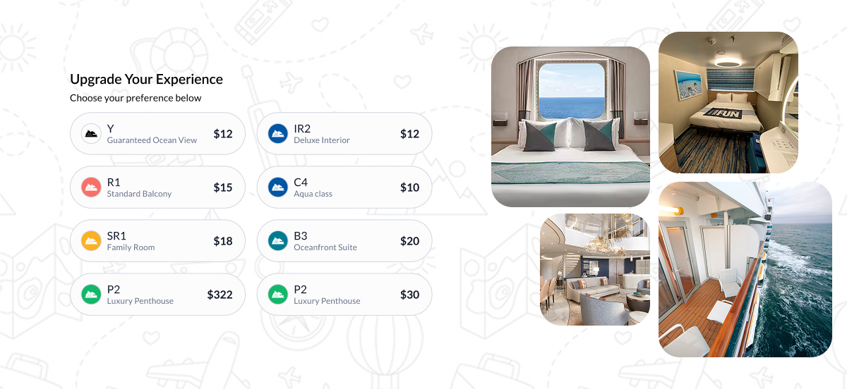 The user selects the cabin type (Interior, Oceanview, Balcony, Suite).